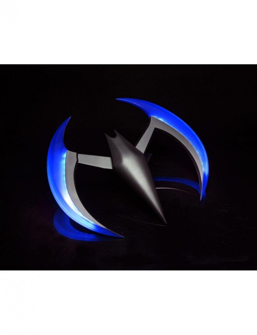 This full-size prop replica of the Batarang comes from the Batman Beyond animated series! The Batarang features blue LED lighting in the wings which can be turned on or off. Measures over 8 inches. Uses 3 button cell batteries, included.